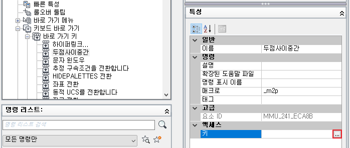 5) 키보드 바로 가기에 명령이 추가되면 오른쪽 특성 창이 보입니다.