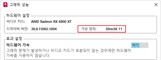 AutoCAD에서 그래픽 문제가 발생할 수 있고 이 때 해결 방법은 DirectX 11로 변경하면 된다고 합니다.
