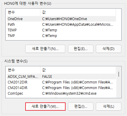 시스템 속성 창 고급 탭의 [환경 변수] 버튼을 클릭합니다.