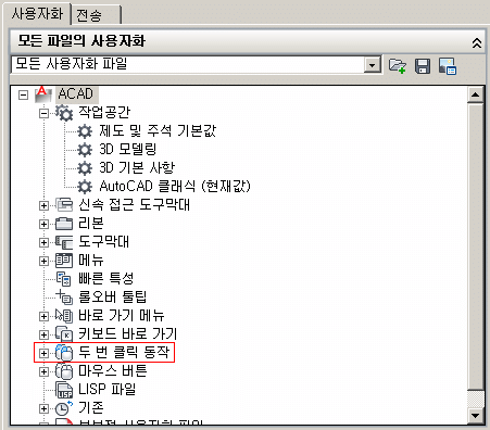 1. 명령창에 CUI를 입력하여 사용자화 창이 뜨면 '두 번 클릭 동작'을 선택합니다.