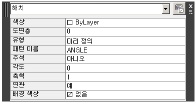 해치의 경우도 두번 클릭하면 해치 편집 창이 나오는 것이 아니라 아래와 같이 속성 창이 뜹니다.