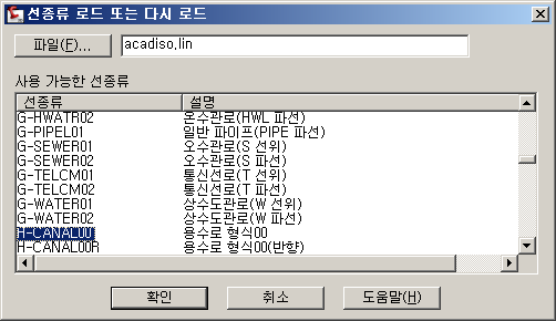키보드의 H를 누르면 아래 그림처럼 H로 시작하는 첫 라인타입이 지정됩니다.
